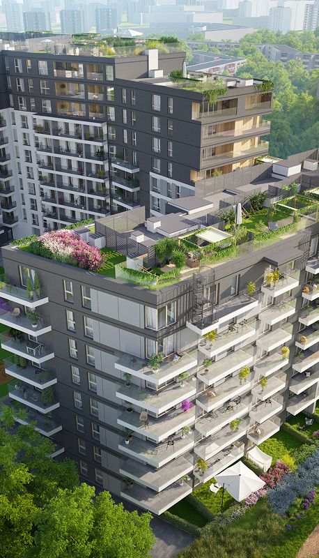 Wychodząc naprzeciw oczekiwaniom klientów na dachu budynku spółka przewidziała zielone tarasy, a tuz przy inwestycji park, ze strefą odpoczynku i relaksu. Zaaranżowany od strony wschodniej inwestycji teren rekreacyjny, z bujną zielenią stworzy doskonałą oprawę dla całości osiedla. Ekskluzywne tarasy na dachu inwestycji z widokiem na panoramę miasta, spełnią oczekiwania nawet najbardziej wymagających klientów, a znajdujące się na nich, tarasole i jacuzzi, przyczynią się do maksymalnego komfortu wypoczynku. Zielone tarasy to współczesny luksus.